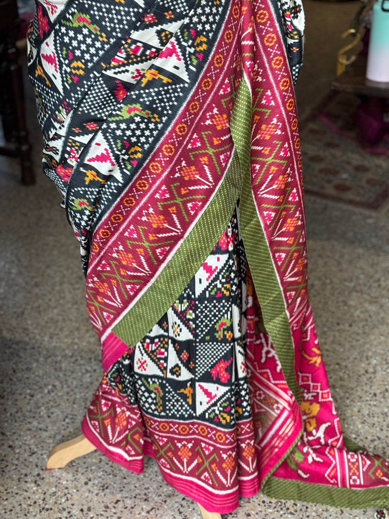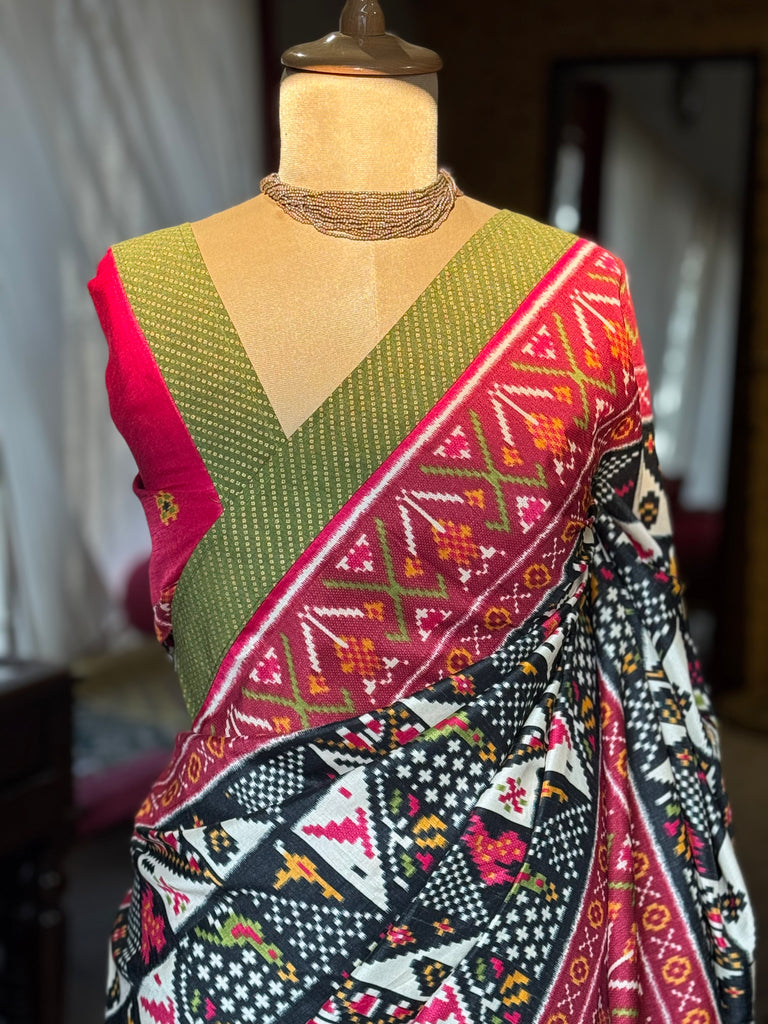 The vibrant interplay of deep pinks, bold blacks, and subtle ivory tones is perfectly complemented by a refreshing green blouse pairing, creating a striking yet graceful look. The detailed border enhances its regal appeal, making it ideal for festive occasions, cultural gatherings, and elegant daywear.
