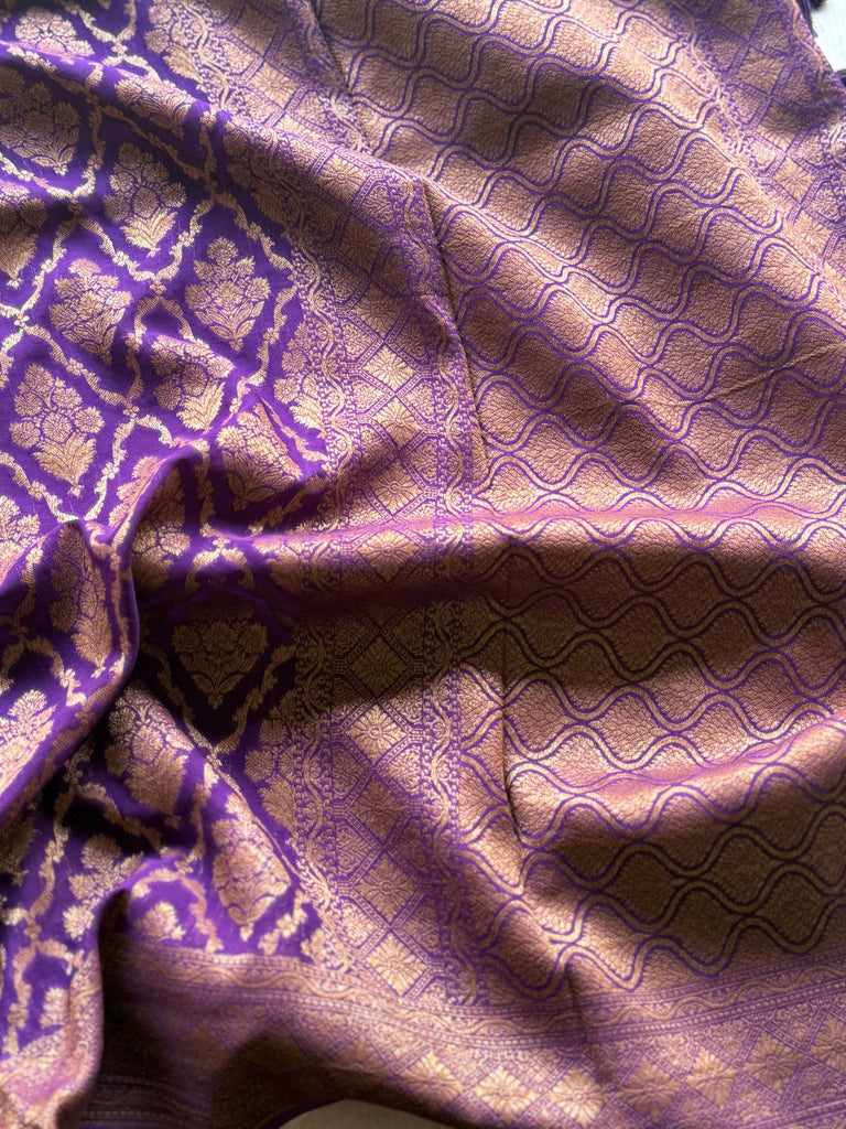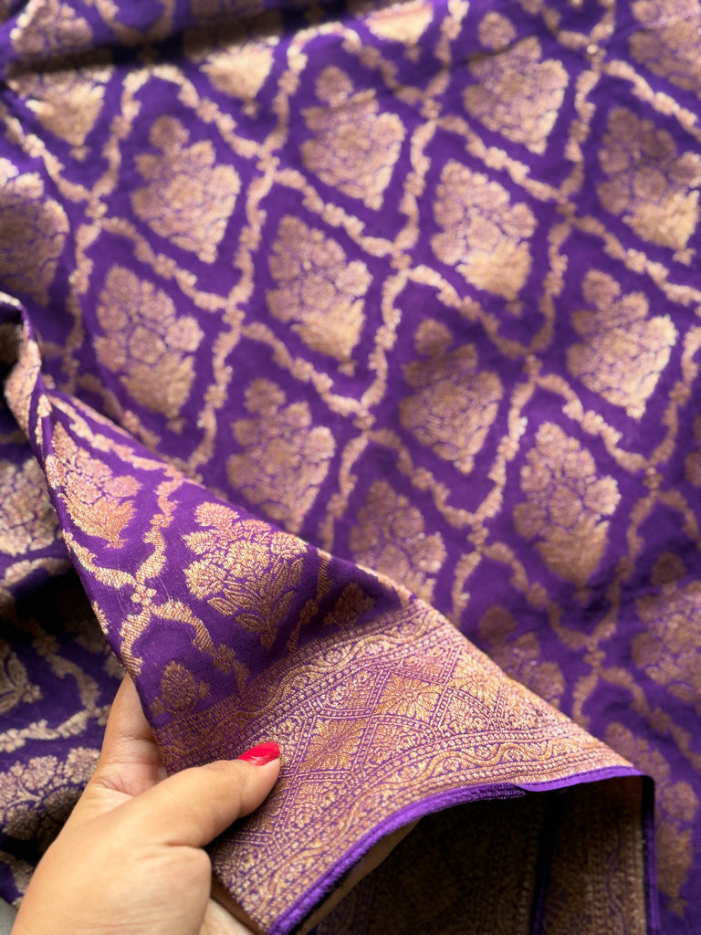 Elevate your ethnic wardrobe with this exquisite Pure Georgette Banarasi Saree, crafted to reflect timeless elegance and royal charm. Woven with intricate full zari work across the entire body, this saree showcases traditional artistry blended with luxurious sophistication.