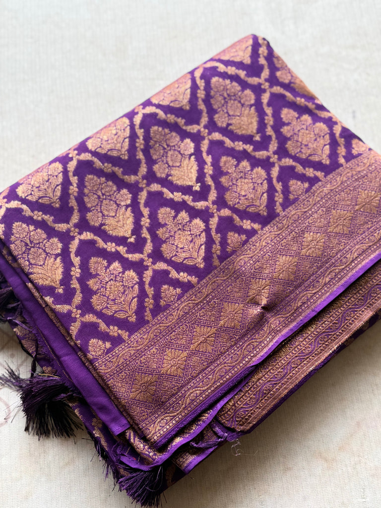 The rich fabric drapes effortlessly, offering a graceful fall and lightweight comfort, while the detailed floral zari motifs add a radiant golden sheen that enhances its regal appeal. The beautifully woven zari border complements the body design, creating a harmonious and opulent finish.Comes with running blouse fabric.