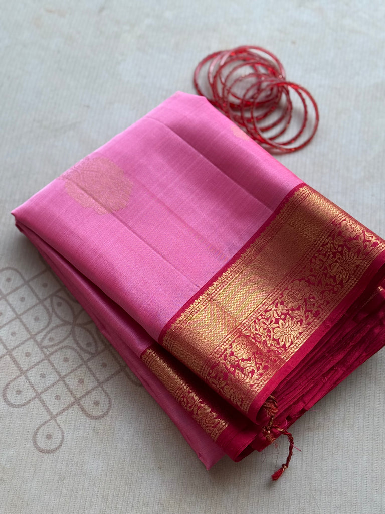 This Pure Kanjivaram Soft Silk Saree – Vintage Edition captures the soul of traditional South Indian weaving in a refined, elegant palette. The saree features a luminous Pink and Red shade with a subtle colour play that reflects beautifully under light, enhancing the natural sheen of soft silk.