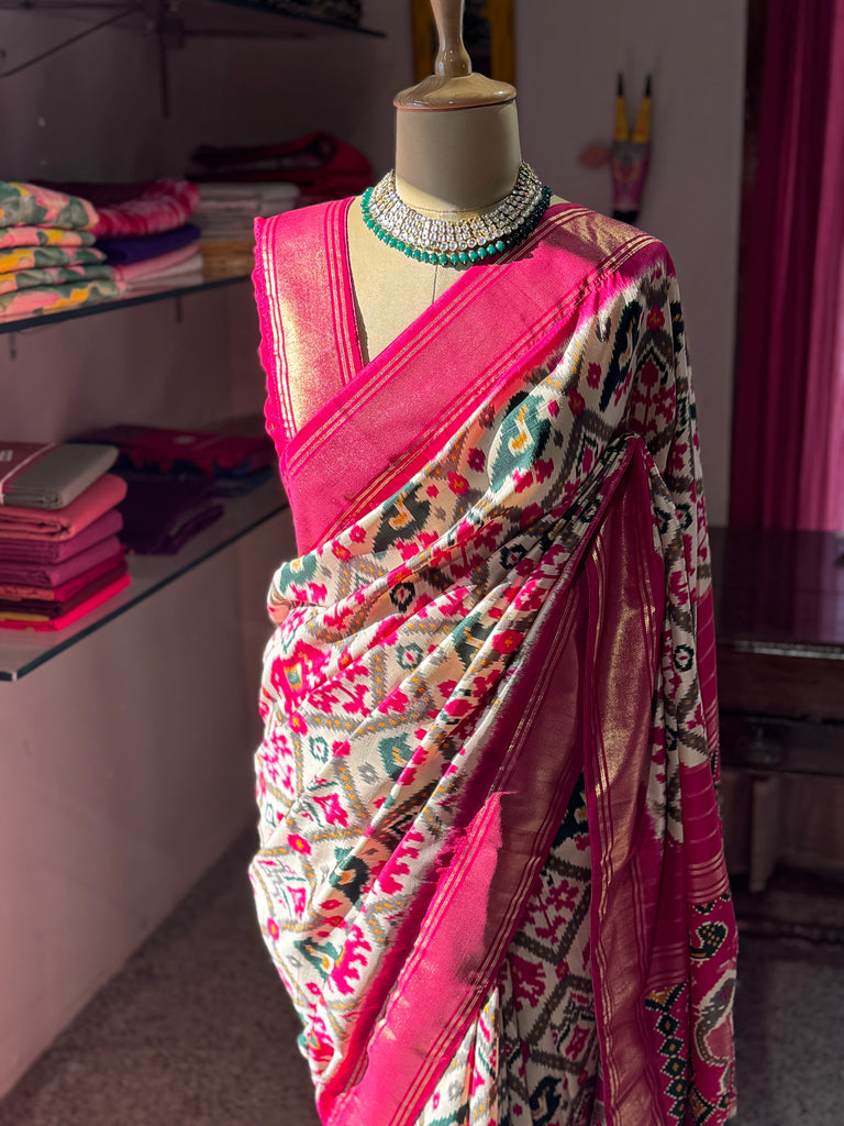 The rich, contrasting khaddi border adds a regal touch with its lustrous finish and fine zari accents, enhancing the saree’s grandeur. The striking interplay of bold pink hues with multicolored ikat-style patterns creates a statement look that is both graceful and eye-catching.