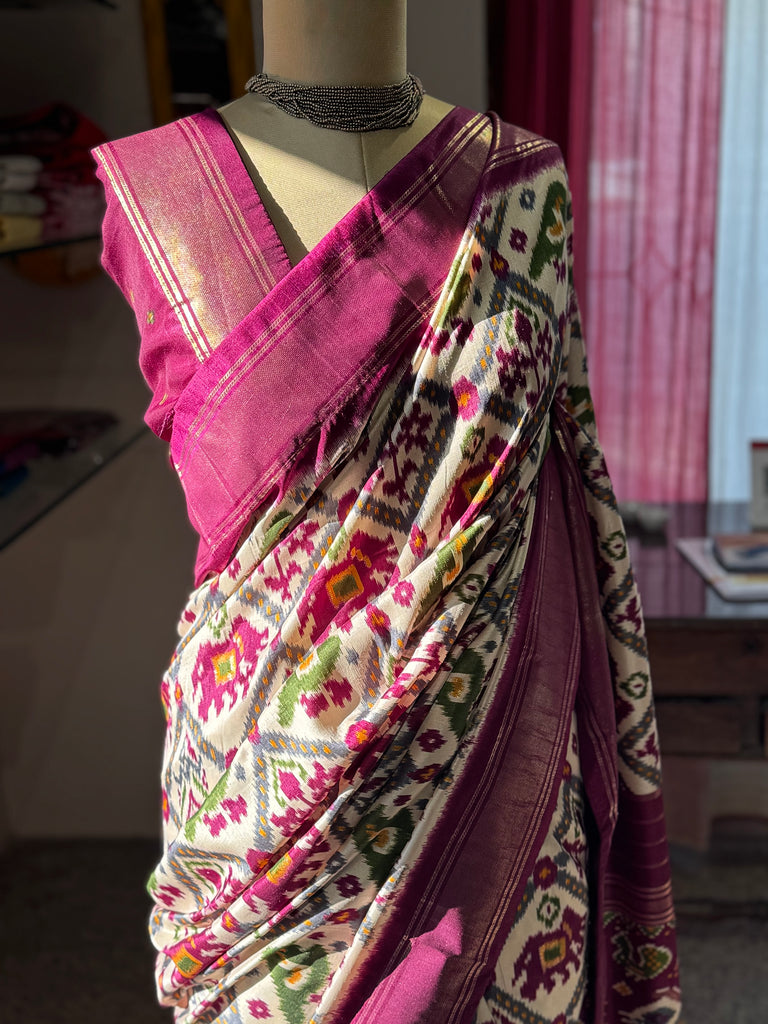 Elevate your ethnic wardrobe with this exquisite Semi Dola Silk Patola saree, a perfect blend of traditional artistry and contemporary elegance. Crafted in luxurious semi dola silk, this saree features intricate Patola-inspired motifs woven beautifully across the body, showcasing timeless craftsmanship and vibrant detailing.