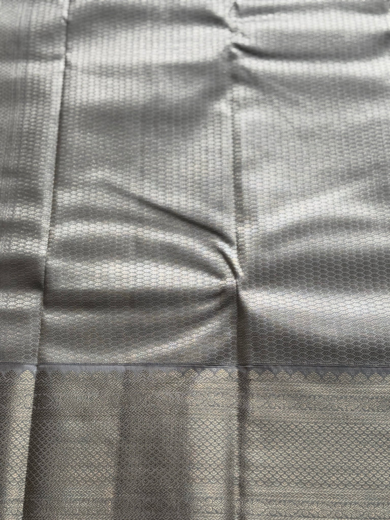 The saree comes paired with a unstitched blouse piece, designed with delicate zari buttas all over. The blouse is further accentuated with a Retta Petta border featuring golden zari peacock motifs, perfectly harmonizing with the saree’s border and elevating the overall look.