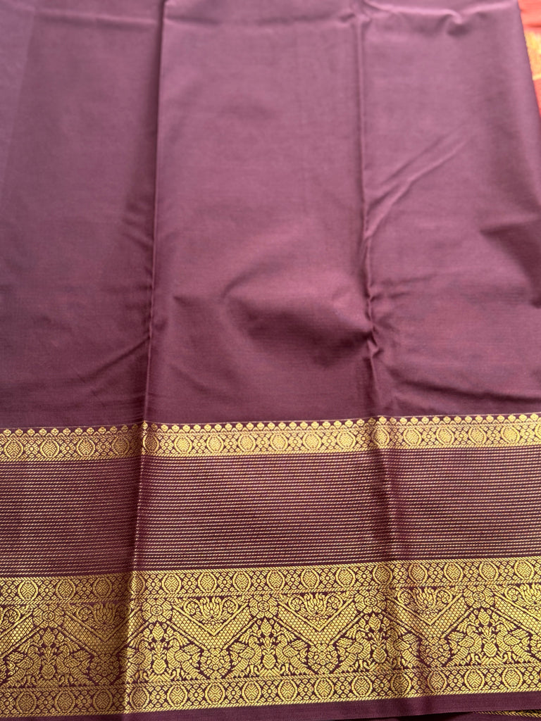 Enhancing its traditional appeal is a striking Retta Petta (double) border, intricately woven with gold zari detailing, lending a bold contrast and classic Kanchi-inspired finish. The saree is completed with a complementing zari-woven pallu, making it an ideal choice for festive occasions and traditional celebrations.