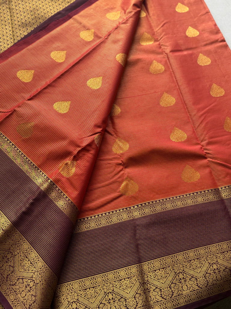 Bring festive charm to your wardrobe with this stunning Semi Kanchi Silk Saree, crafted to reflect timeless South Indian elegance. The saree features a rust orange body, beautifully adorned with delicate golden zari buttas that add a subtle sparkle and refined grace.