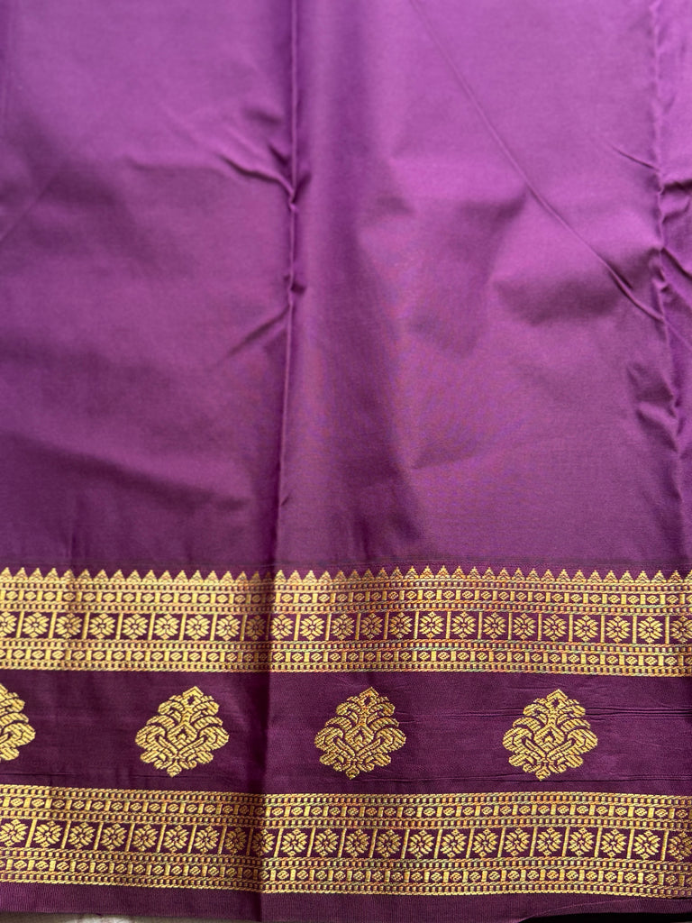 Enhancing its traditional appeal is a striking deep purple Retta Petta (double) border, intricately woven with gold zari detailing, lending a bold contrast and classic Kanchi-inspired finish. The saree is completed with a complementing zari-woven pallu, making it an ideal choice for festive occasions and traditional celebrations.