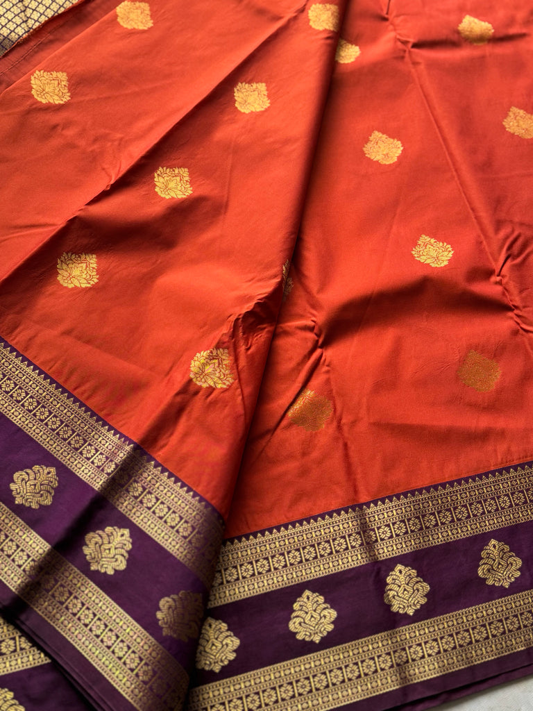 Bring festive charm to your wardrobe with this stunning Semi Kanchi Silk Saree, crafted to reflect timeless South Indian elegance. The saree features a rich rust orange body, beautifully adorned with delicate golden zari buttas that add a subtle sparkle and refined grace.