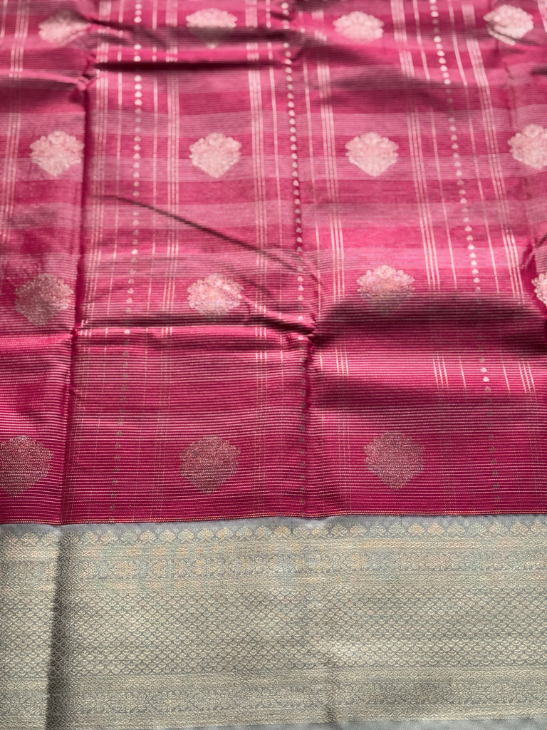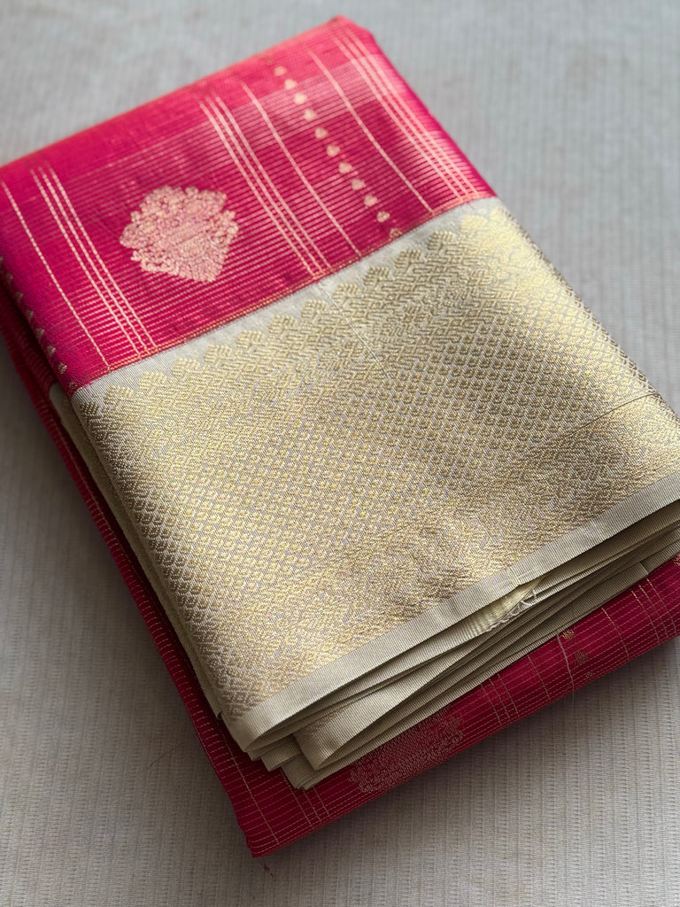 Bring festive charm to your wardrobe with this stunning Semi Kanchi Silk Saree, crafted to reflect timeless South Indian elegance. The saree features a rich pink body, beautifully adorned with delicate golden zari buttas that add a subtle sparkle and refined grace.
