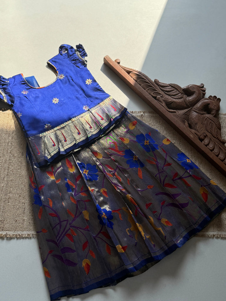 Beautiful kids skirt with bodice and peplum top in Paithani fabric , so apt for this hot summer. Blue shade.