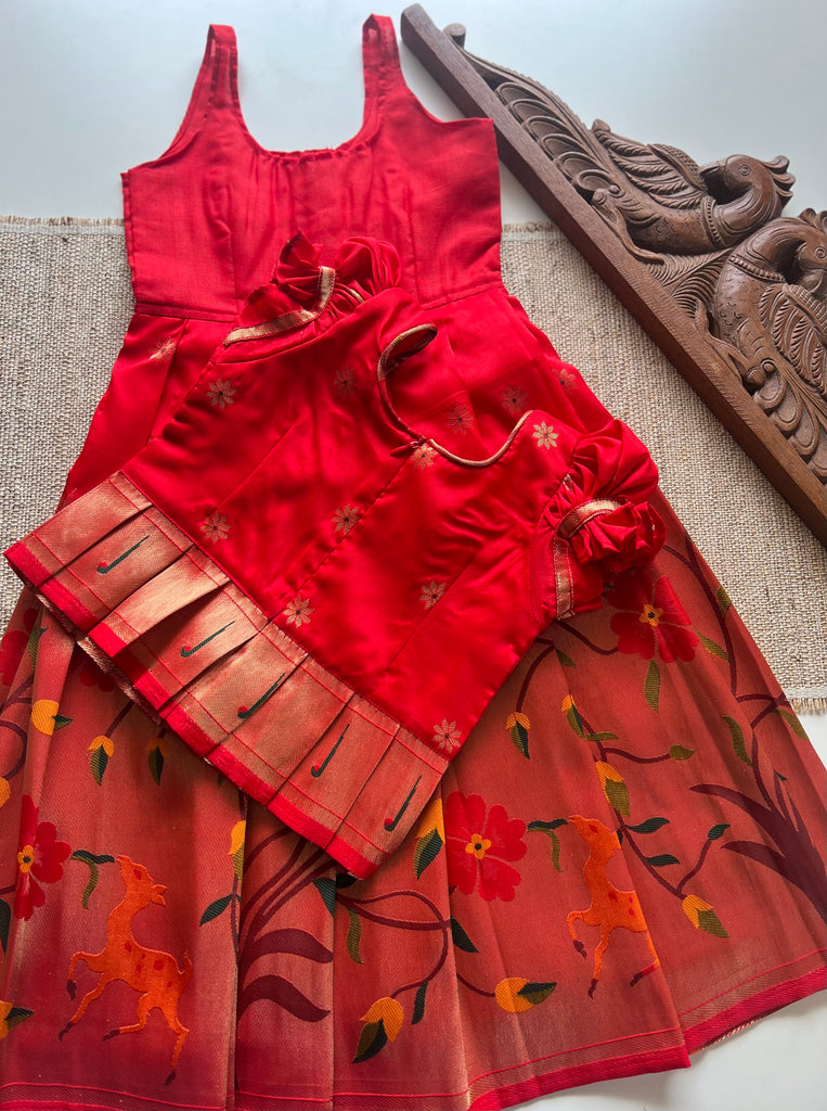 Beautiful kids skirt with bodice and peplum top in Paithani fabric , so apt for this hot summer. RED