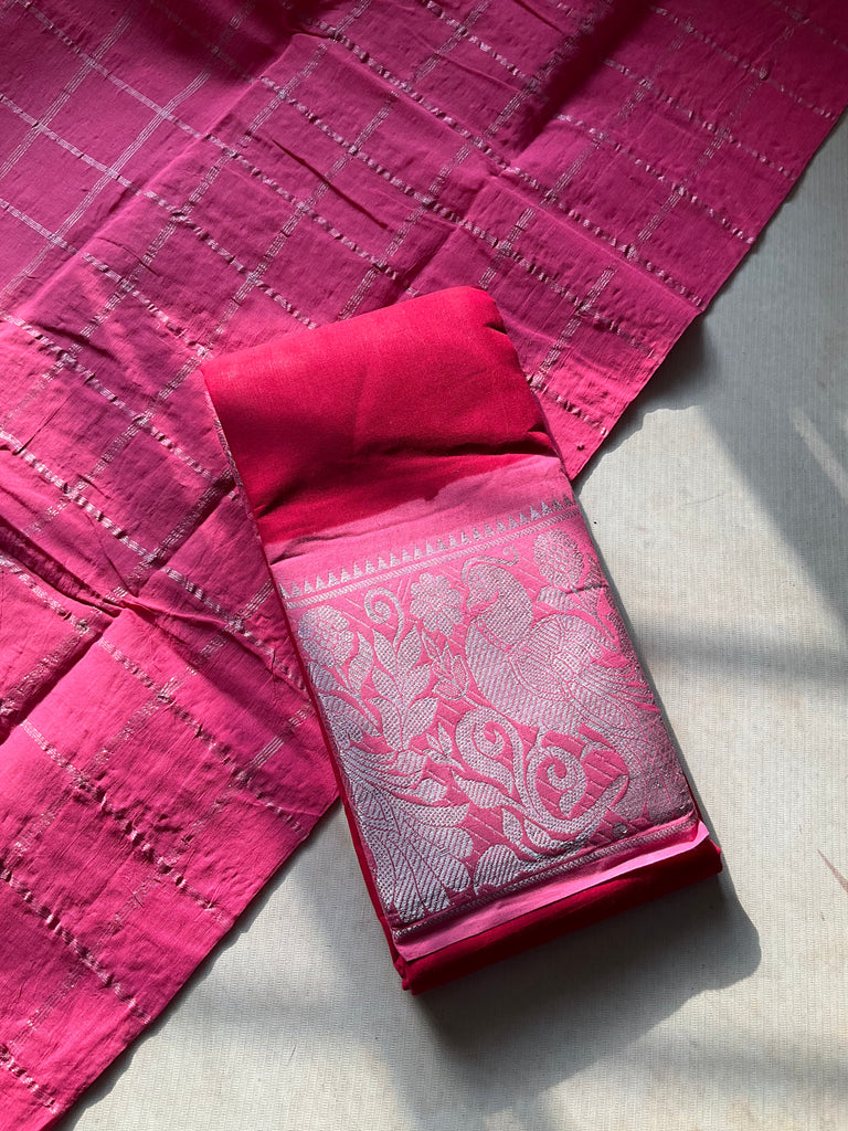 Exclusive Kurta set , designed in a Beautiful Red shade with Pink zari border in Boat Neck pattern with Pink silver zari big checkered Dupatta !
