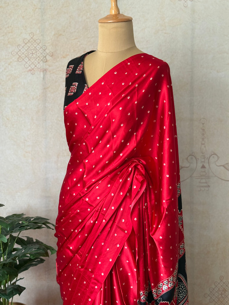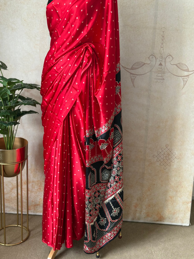 Celebrate the beauty of Indian handcrafts with this Modal Saree featuring all-over Bandhini buttas, a traditional Ajrakh pallu, and a matching Ajrakh blouse, curated by Studio Virupa.