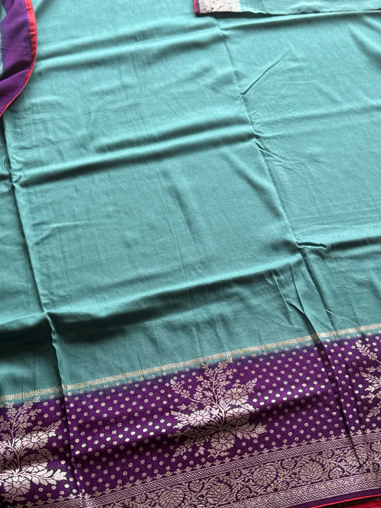 Elevate your festive wardrobe with this exquisite Teal Blue Banarasi Semi Tussar Silk Saree, beautifully paired with a rich royal purple contrast border and pallu. The body features a smooth teal green weave that radiates understated elegance, while the deep purple border is intricately adorned with classic silver zari buttas, creating a striking visual contrast.
