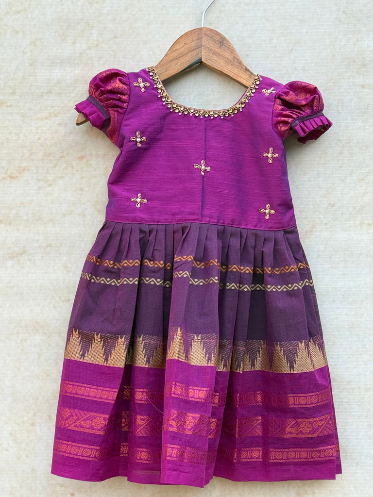 Tags: Chettinad Cotton, Kids Ethnic Wear, Aari Embroidery, Traditional Frock, Korvi Border, Festive Wear, Handcrafted, Indian Kids Fashion, Puffed Sleeves, Zari Work