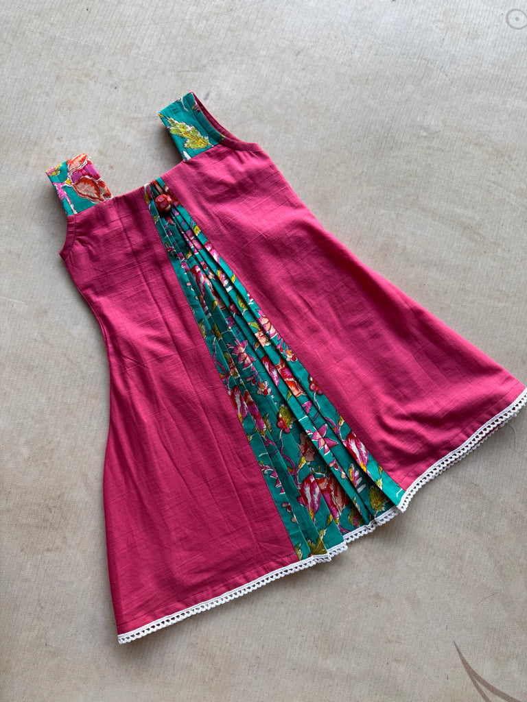 Bring effortless charm to your child’s wardrobe with this beautifully designed soft cotton dress from Virupa. Crafted in a soothing deep pink base, this dress is elevated with a striking turquoise blue pleated panel at the front, featuring delicate floral hand block-inspired prints in subtle blue tones.