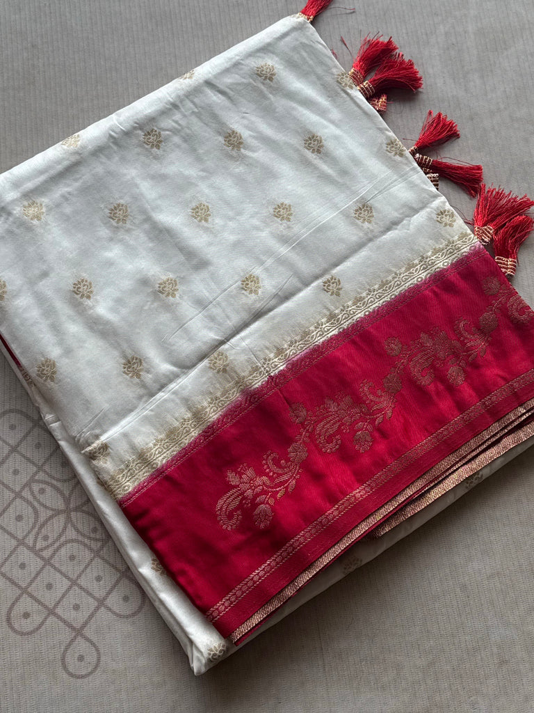Celebrate timeless elegance with this stunning Banarasi Saree crafted in a soothing White body paired with a regal contrast red border and pallu. The saree features delicate zari woven buttas all over the body, creating a graceful shimmer that enhances its traditional appeal.